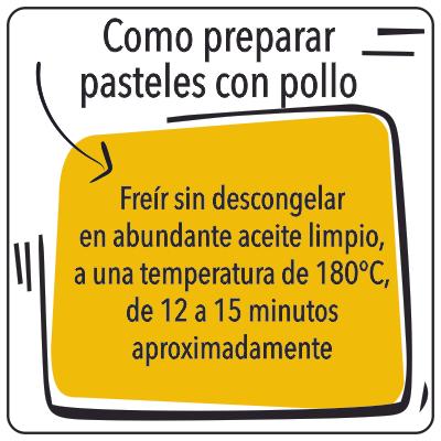 Para freír los pasteles de pollo congelados se requiere abundante aceite a una temperatura de 160 grados; el aceite debe estar caliente, mas no echando humo, pues el pastel puede dorarse por fuera y quedar frío en su interior. El tiempo de fritura es de aproximadamente 15 minutos.